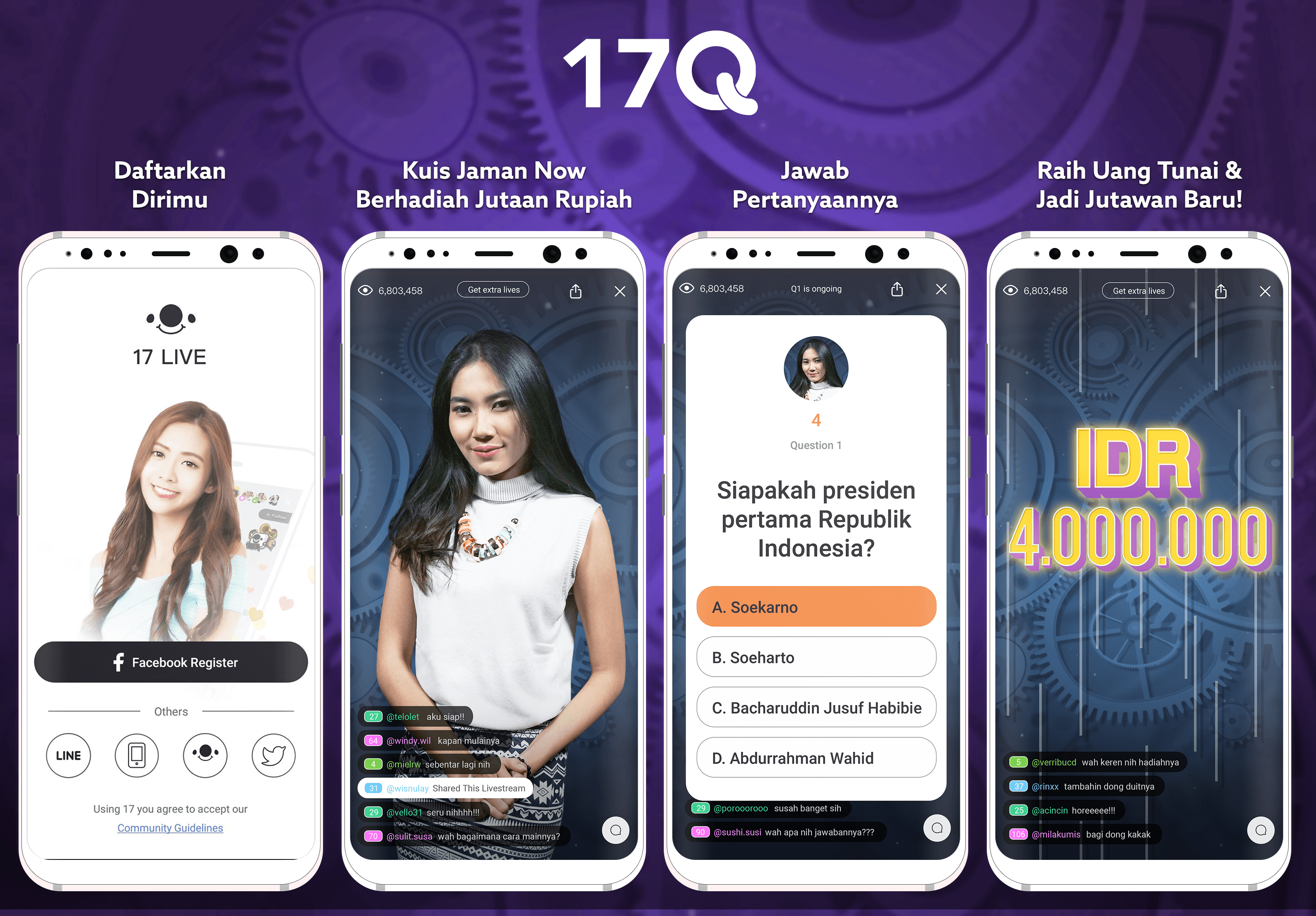 17 LIVE, aplikasi livestreaming pertama di Indonesia yang menghadirkan kuis trivia live dengan hadiah jutaan Rupiah tunai di setiap episodenya. Kuis trivia live merupakan permainan menjawab pertanyaan umum yang sudah ramai dimainkan di berbagai negara. Lewat jargon “Kuis Jaman Now”, 17Q yang tayang perdana pada hari Sabtu, 6 Januari 2018 kemarin mendapatkan sambutan yang baik dan telah menarik perhatian para warganet.