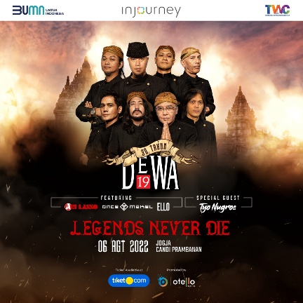 Konser 30 TAHUN DEWA 19 – JOGJA CANDI PRAMBANAN akan mulai pada pukul 20.00 WIB. “Kapanlagi bisa nonton 3 vokalis sekaligus dalam satu panggung Ari Lasso, Once Makel, Ello, dengan special guest Tyo Nugros, mereka semua Living Legends yang membesarkan DEWA 19 di tanah air, mereka akan hadir di Konser 30 Tahun DEWA 19 di Jogja – Candi Prambanan and yup, Legends Never Die…“ Ujar Sysan Ibrahim.