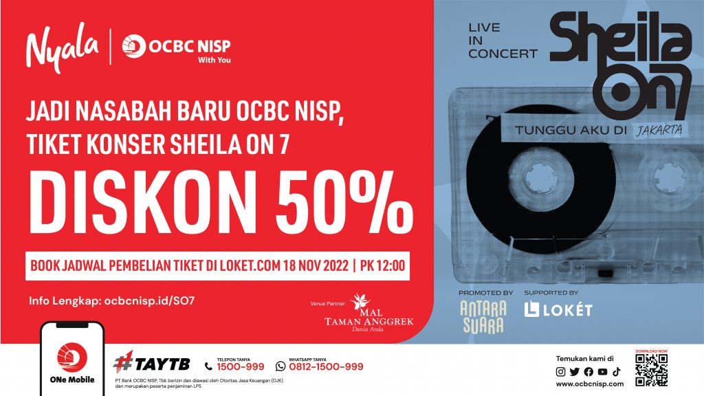 Untuk memenuhi harapan tersebut, Antara Suara selaku partner pelaksana konser ‘Tunggu Aku Di Jakarta’ menggandeng Official Bank Partner OCBC NISP untuk merilis ribuan tiket spesial. Khusus nasabah baru yang membuka rekening NYALA OCBC NISP dan melakukan penempatan deposito mulai Rp 1 juta bisa membeli tiket konser Sheila On 7 ‘Tunggu Aku Di Jakarta’ dengan spesial diskon 50%.