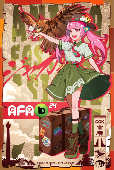 Visual utamanya menampilkan maskot asli Anime Festival Asia, yaitu Seika, yang dikelilingi oleh elemen-elemen ikonik Indonesia. Ini termasuk motif batik pada syal dan ikat pinggangnya; Rafflesia Arnoldii pada topinya, dan siluet Monas – Monumen Nasional Indonesia, pada latar belakangnya. Koper Seika dihiasi dengan stiker logo ikonik AFA serta tag yang menampilkan simbol budaya Indonesia, yang menyatu dengan pose Seika yang siap bepergian saat ia bersiap untuk berkeliling Indonesia ditemani burung nasional Elang Jawa. Visual yang diartikulasikan dengan baik ini menetapkan suasana acara dan melambangkan kreativitas dan hiburan berkaliber tinggi yang dapat dinikmati oleh para pengunjung.