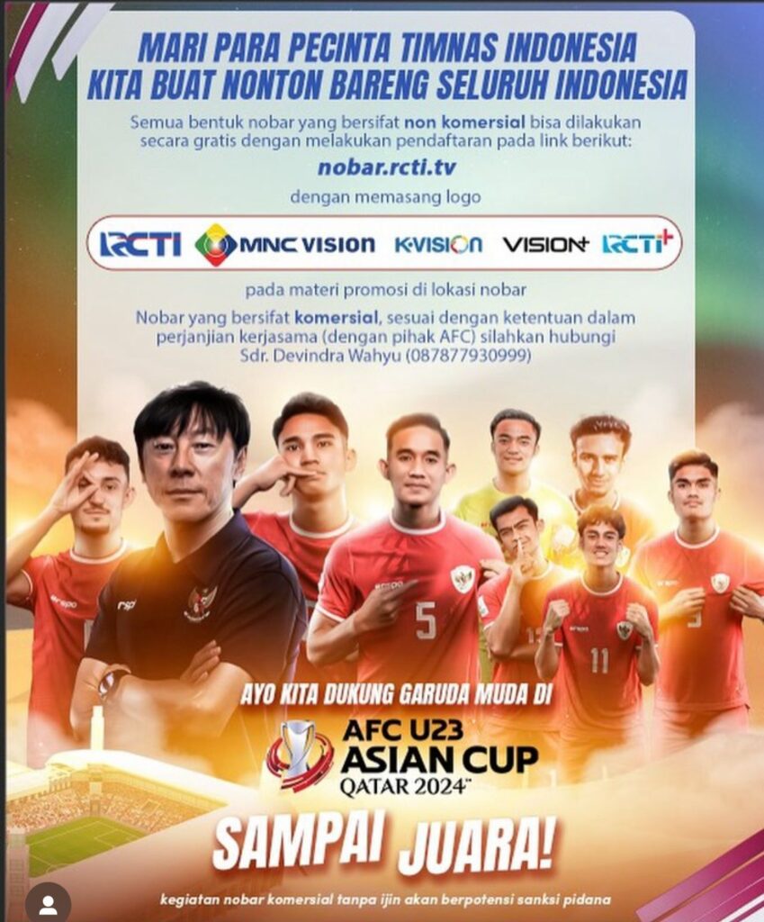 MNC Group selaku pemegang hak siar Piala Asia U-23, melalui televisi free to air yang dimiliki yakni RCTI, pay tv MNC Vision, K-Vision serta aplikasi Vision+ dan RCTI+, terus memberikan dukungan dengan menghadirkan tayangan Piala Asia U-23 agar dapat disaksikan oleh seluruh masyarat Indonesia. Oleh karena itu, MNC Group selaku pemegang hak siar, mengajak masyarakat ikut berpartisipasi dalam nobar yang diselenggarakan oleh pihak yang terdaftar secara resmi.