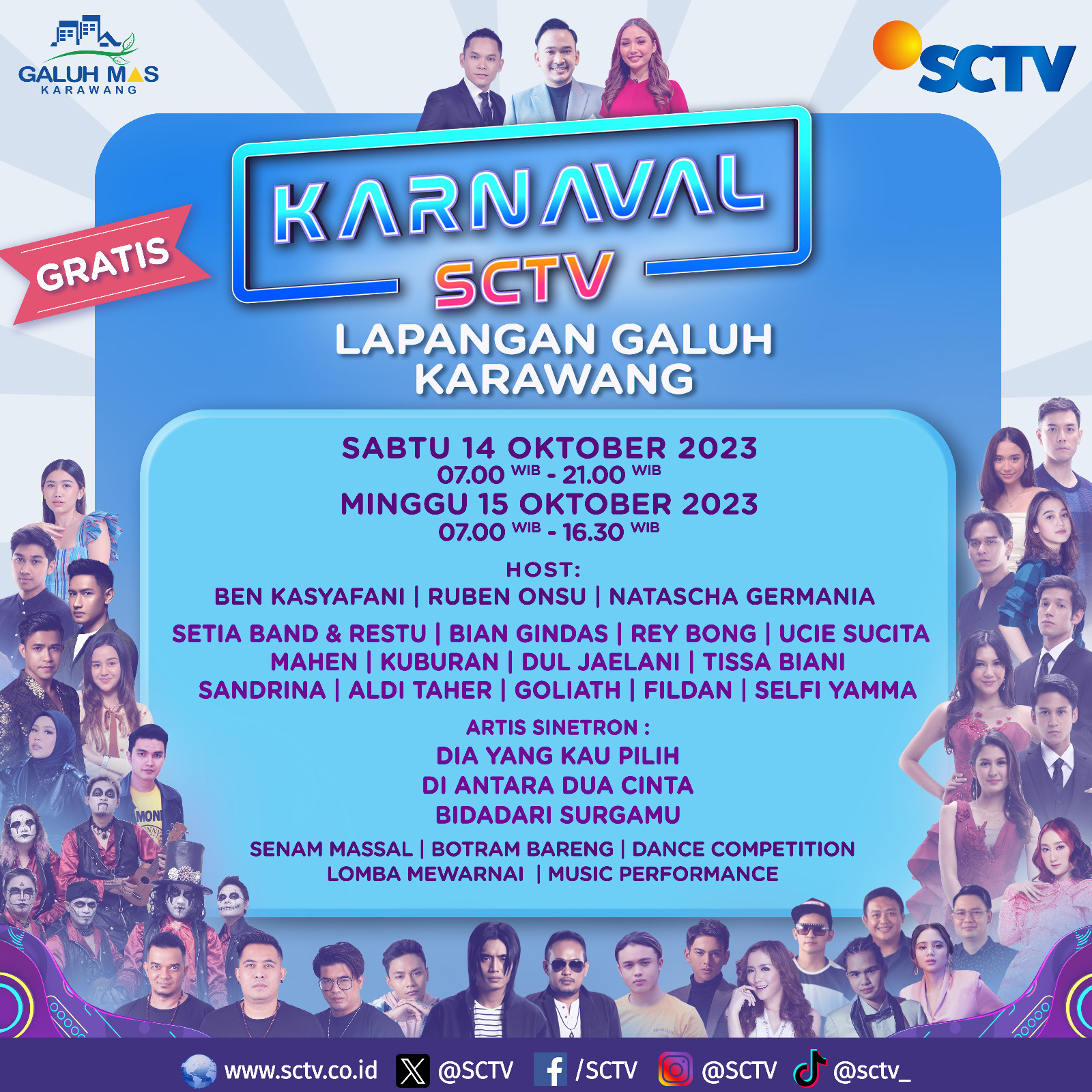 Pada hari pertama digelar tepatnya Sabtu, 14 Oktober 2023 LIVE mulai pukul 14.00 WIB, “KARNAVAL SCTV” akan dimeriahkan oleh Five Minutes bersama BIAN Gindas, Rey Bong, Ucie Sucita, dan Mahen, serta pemain sinetron “Dia Yang Kau Pilih” yakni, Zoe Abbas Jackson, Antonio Blanco Jr, Naufal Samudra, dan Djihan Ranti. Keesokan harinya pada Minggu, 24 September 2023, “KARNAVAL SCTV” akan disiarkan secara LIVE sebanyak dua kali yakni, pada pukul 07.00 WIB dan 14.00 WIB. Grup band Kuburan, Dul Jaelani, Tissa Biani, Sandrina, dan Aldi Taher bersama pemain sinetron “Di Antara Dua Cinta” yakni, Esta Pramanita, Rangga Azof, Asha Assuncao, dan Anthony Xie akan menghibur warga Karawang dan sekitarnya di panggung “KARNAVAL SCTV” Minggu pagi pukul 07.00 WIB. Sementara di Minggu siang pukul 14.30 WIB, “KARNAVAL SCTV” akan dimeriahkan dengan penampilan dari Setia Band & Restu, Goliath, Fildan, Selfi Yamma, serta pemain sinetron “Bidadari Surgamu” yang kian digemari pemirsa yakni, Josephine Firmstone, Lian Firman, Yabes Yosia, dan Virza Oreel.