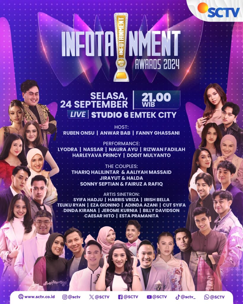 Malam penganugerahan Infotainment Awards 2024 akan semakin meriah dengan kehadiran para pemain sinetron yang menjadi idola pemirsa SCTV seperti Syifa Hadju, Harris Vriza, Irish Bella, Teuku Ryan, Eza Gionino, Adinda Azani, Jerome Kurnia, Billy Davidson, Esta Pramanita, Caesar Hito, Cut Syifa.