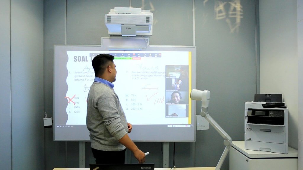Pada skenario PJJ daring, Guru di sekolah dapat mengajar menggunakan Proyektor Interaktif EB-1485Fi dengan memanfaatkan aplikasi Easy Interactive Tools yang sudah disediakan oleh Epson dan terhubung dengan aplikasi video conference melalui laptop.