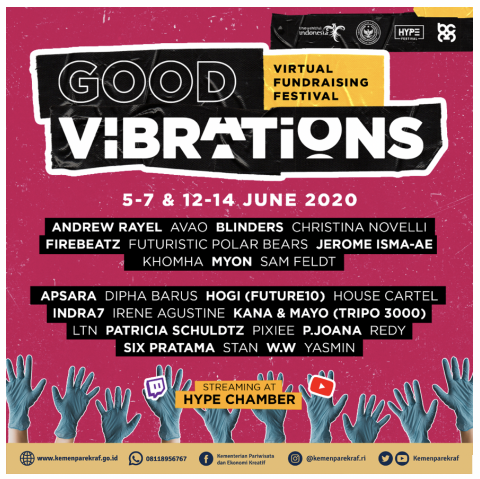 Kali ini Hype Festival yang merupakan salah satu promoter kenamaan di tanah air bekerjasama dengan Building Culture Movement (BCM) dan didukung oleh Kementerian Pariwisata & Ekonomi Kreatif (Kemenparekraf) Indonesia akan menggelar acara “GOOD VIBRATIONS”, yang merupakan sebuah festival musik dengan tujuan penggalangan dana, acara ‘live streaming’ pertama yang melibatkan 27 DJ Lokal dan Internasional di Indonesia.