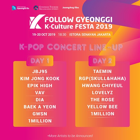 Menurut Lee Dong Ryoul dari Gyeonggi Tourism Organization. “Kami ingin menghadirkan beragam kebudayaan Korea, sekaligus menunjukkan kepada warga Indonesia bahwa Gyeonggi-do merupakan pusat dari kebudayaan Korea. Untuk menarik pengunjung pada event ini kami hadirkan artis-artis top Korea. Pada 19 Oktober 2019 kami akan menghadirkan JBJ95, Kim Jong Kook, Epik High, DIA, VAV, Baek A Yeon, GWSN, 1Million dan sebuah grup penyanyi yang spesial dengan total 9 tim. Kemudian pada 20 Oktober 2019, kami akan menghadirkan pula SHINee TAEMIN, RGP (Haha & Skull), Hwang Chi Yeul, Lovelyz, The Rose, Yellow Bee, 1Million dan sebuah grup wanita yang spesial juga dengan total 8 tim.”