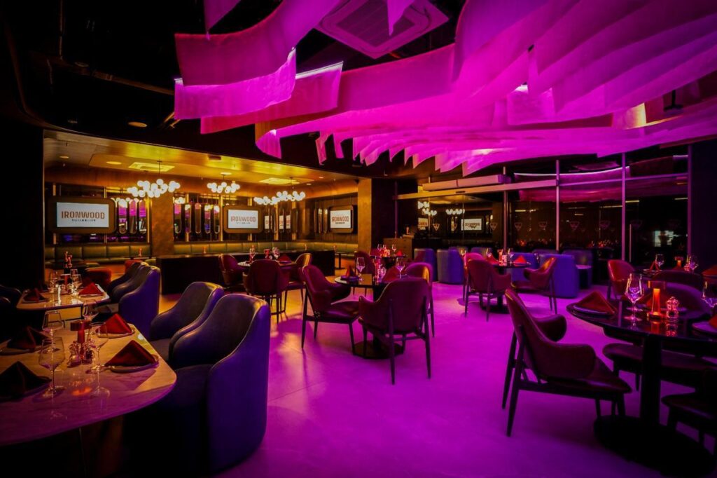 Di Ironwood, atmosfer ruang dirancang untuk mencerminkan semangat urban Asia yang progresif, ekspresif, dan penuh karakter. Cahaya neon warna-warni menjadi aksen visual utama yang membangkitkan semangat malam khas kota metropolitan; penuh energi, dinamis, dan berani. Elemen ini dipadukan secara seimbang dengan furniture modern yang memberikan kenyamanan elegan, serta detail kontemporer yang menciptakan nuansa hangat serta kesan edgy. Dengan pilihan tempat duduk indoor maupun outdoor, memandang lapangan golf, Ironwood memberi keleluasaan bagi pengunjung untuk menikmati suasana sesuai preferensi, baik itu untuk perbincangan santai, perayaan, atau sekadar rehat setelah sesi bermain golf. Dengan total kapasitas 124 kursi menjadikan restoran ini sebagai destinasi yang merayakan kebersamaan dan ekspresi. Lebih dari sekadar tempat makan, Ironwood adalah “stage for flavour”, di mana momen bersantap diharapkan dapat menjadi pengalaman yang berkesan.