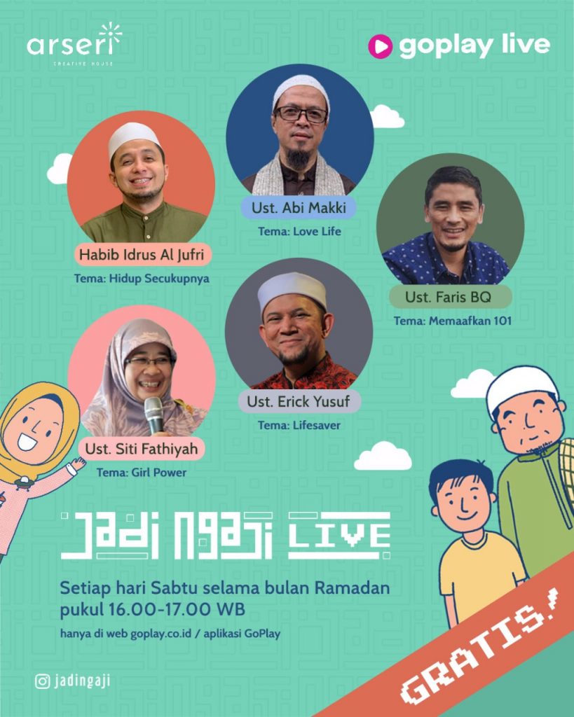 Selain itu pada ramadan ini, Arseri Creative House bersama dengan GoPlay Indonesia akan menyuguhkan tayangan terbaru berupa kajian interaktif ‘Jadi Ngaji Live’ yaitu sebuah kajian interaktif berbasis live streaming yang bisa dinikmati setiap hari Sabtu, pukul 16.00 – 17.00 WIB.