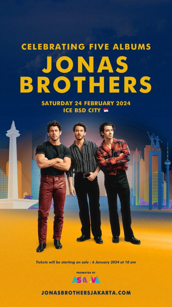 David Ananda – selaku Managing Director Color Asia Live mengatakan,”Color Asia Live sangat senang dapat membawa Jonas Brothers ke Indonesia, jangan lewatkan kesempatan ini untuk menjadi bagian dari sejarah karena Jonas Brothers akan mengguncang panggung Asia hanya di Indonesia & Filipina pada tahun 2024. Nantikan penjualan tiket di Indonesia yang akan dibuka pada hari Sabtu, 6 Januari 2024 di www.jonasbrothersjakarta.com pukul 10.00 WIB.”
