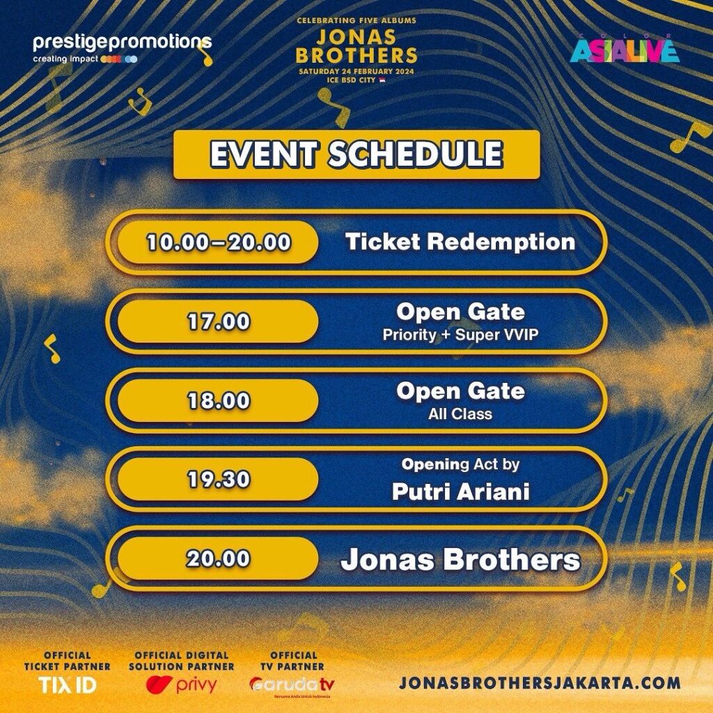 Untuk semua penggemar musik dan para pecinta Jonas Brothers bergabunglah dalam momen bersejarah ini. Persiapkan diri anda untuk pengalaman konser yang penuh kesan dan tak terlupakan, tickets dapat dibeli melalui: www.jonasbrothersjakarta.com.