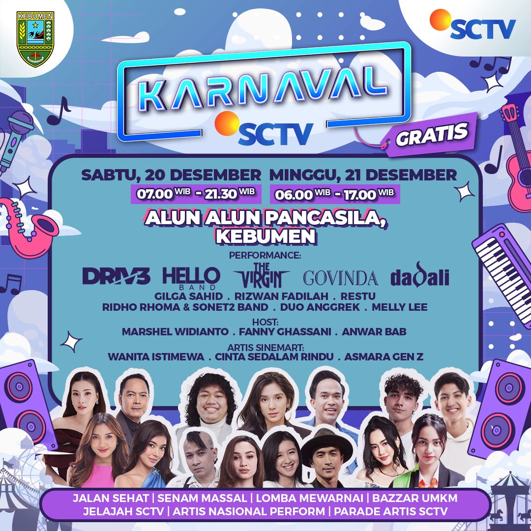 Datang dan meriahkan “Karnaval SCTV” pada hari Sabtu, 20 Desember 2025 dan Minggu, 21 Desember 2025 di Alun-Alun Pancasila Kebumen – Jawa Tengah! GRATIS!