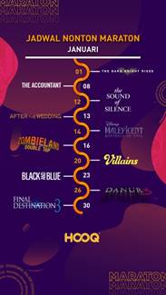 Selain 3 film di atas HOOQ juga menghadirkan film dan series yang tidak kalah menarik lainnya seperti The Sound of Silence, After The Wedding, Zombie Land, Villains, dan Black and Blue. Film produksi Disney dengan genre fantasi, Maleficent: Mistress of Evil, juga akan turut menghibur pengguna HOOQ di awal tahun ini mulai 14 Januari 2020. Untuk penggemar film horor misteri nasional, HOOQ juga menghadirkan Danur 3: Suryanuri yang dapat ditonton melalui aplikasi HOOQ mulai 26 Januari 2020.