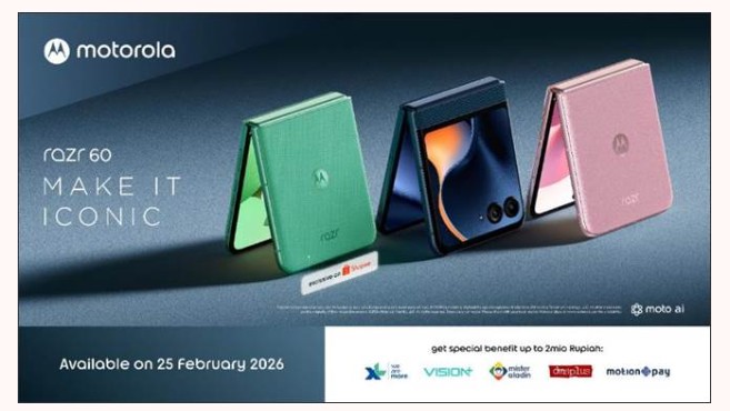 motorola razr 60 akan tersedia di Indonesia mulai 25 Februari 2026, dapat dibeli di shopee Indonesia dan beberapa outlet Digiplus. Pantau terus situs web kami di Motorola.id serta media sosial kami di Facebook, X, Instagram, TikTok, dan YouTube – untuk informasi lebih lanjut mengenai harga, tanggal pra-pemesanan, dan ketersediaan resmi di toko ritel.