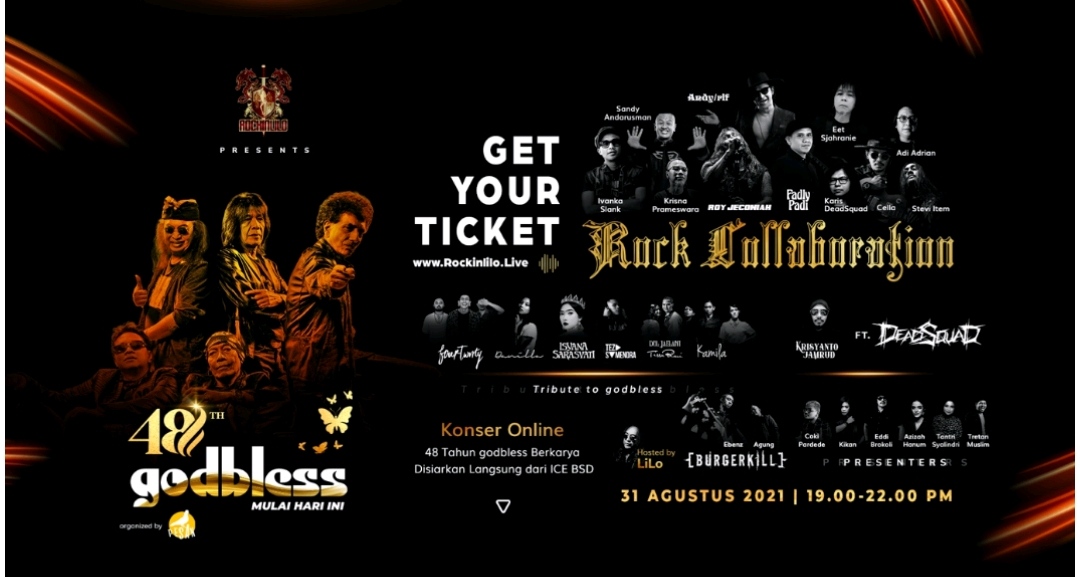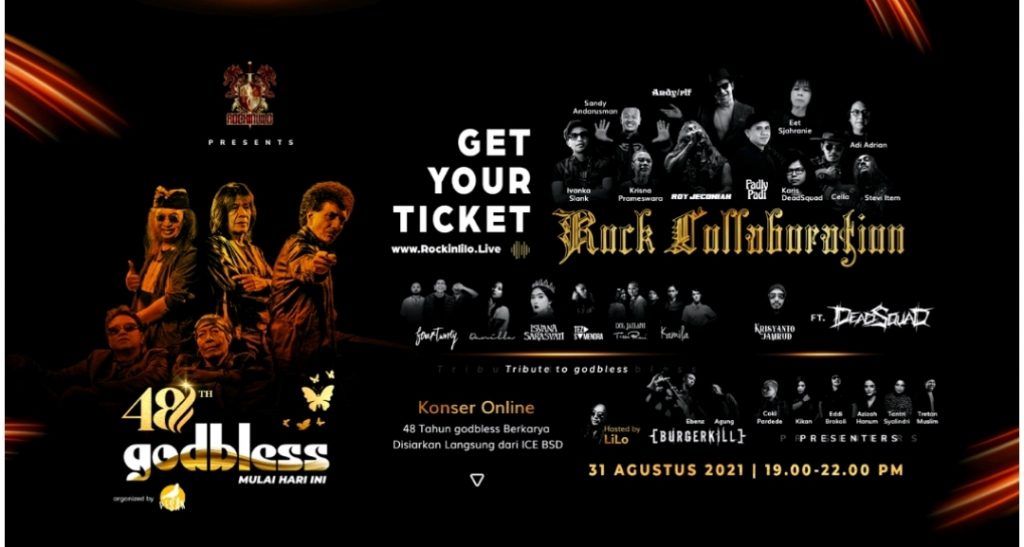Persiapkan waktu anda untuk menyaksikan penampilan sang legenda godbless di tanah air, pertunjukan spektakuler ini akan berlangsung secara online / virtual pada hari Selasa, 31 Agustus 2021 pukul 19.00 – 22.00 WIB dan dapat disaksikan secara virtual melalui www.ROCKINLILO.live