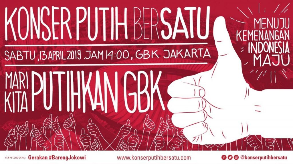 Para pekerja seni, relawan, ormas dan berbagai komunitas pendukung Jokowi-Amin berencana menggelar Konser Putih Bersatu ‘Menuju Kemenangan Indonesia Maju’ di GBK, Jakarta pada 13 April 2019.
