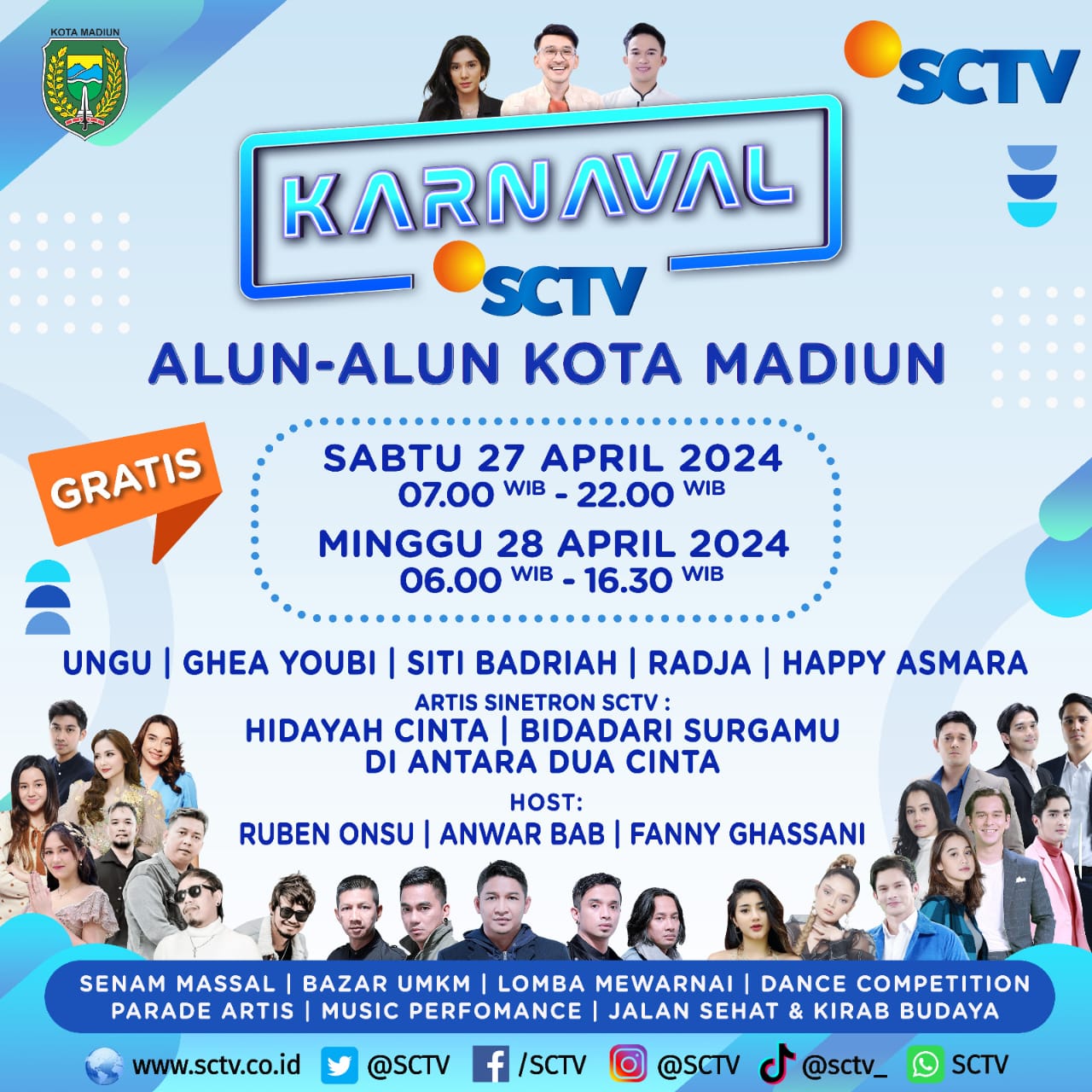 Datang dan saksikan “KARNAVAL SCTV” di Alun-Alun Kota Madiun, pada Sabtu, 27 April 2024 hingga Minggu, 28 April 2024! GRATIS.
