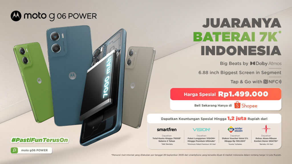 Bagus Prasetyo, Country Head, Motorola Indonesia, mengatakan: “Di Motorola, kami percaya bahwa teknologi premium harus dapat diakses oleh semua orang, tak terbatasi oleh harga. moto g06 POWER mewujudkan visi ini dengan menggabungkan inovasi, dampak, dan desain yang cermat. Kapasitas baterainya yang besar memungkinkan penggunaan dalam Waktu lama, sementara speaker stereo Dolby Atmos yang imersif dan layar 6,88” 120Hz terbesar di segmennya, menawarkan pengalaman hiburan luar biasa dan lebih lama dari yang pernah ada. Dengan mendobrak batasan dari apa yang bisa ditawarkan oleh sebuah smartphone entry-level, kami mendefinisikan ulang ekspektasi dan menetapkan standar baru di segmen value. Melalui moto g06 POWER, Motorola menegaskan kembali komitmen untuk mendemokrasikan teknologi — menadikan pengalaman yang canggih, andal, dan menginspirasi tersedia bagi siapa pun.”