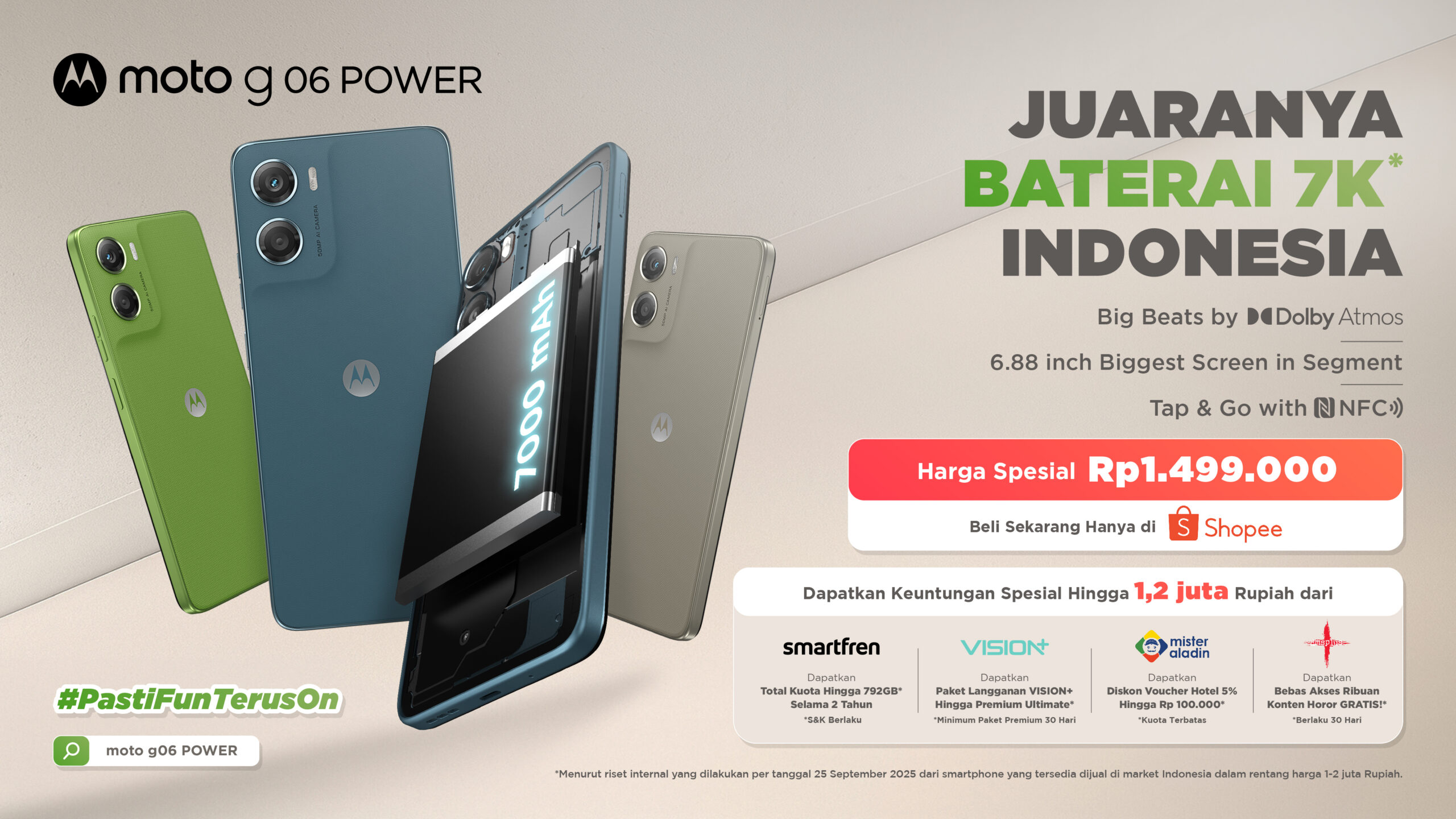 Smartphone moto g06 POWER tersedia dalam tiga pilihan warna terkurasi Pantone™: Tapestry, Laurel Oak, dan Tendril. Mulai dijual hari ini, 9 Oktober 2025, secara eksklusif di Shopee dengan harga Rp 1,499,000.
