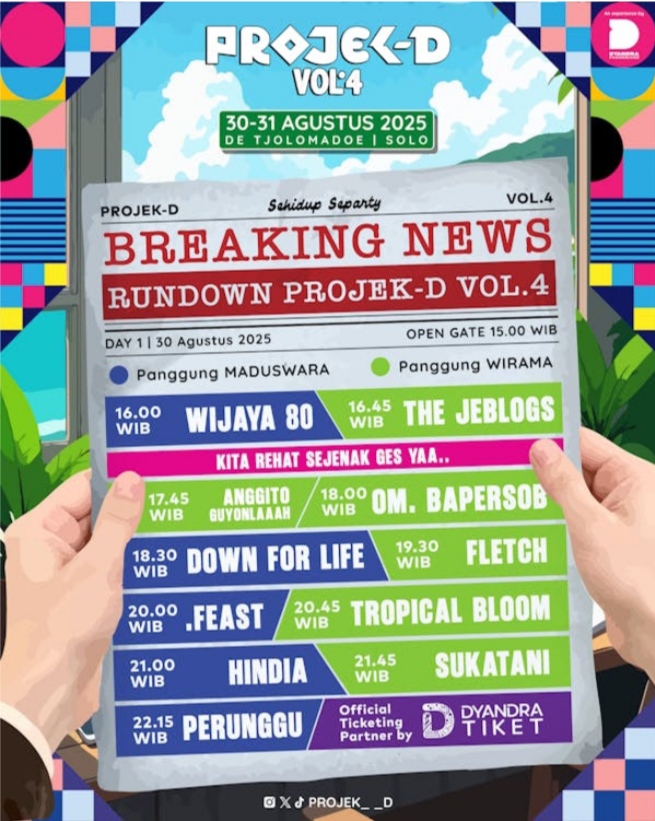 “Kami sangat antusias menyambut kembali para penggemar musik di PROJEK-D VOL. 4,” ujar Data Pratama, Project Manager PROJEK-D VOL.4. “Dengan dirilisnya rundown ini, kami berharap semua pengunjung dapat bersiap dan menikmati setiap penampilan dari musisi favorit mereka. Kami telah menyiapkan berbagai kejutan dan pengalaman baru yang sejalan dengan semangat “Sehidup Separty” untuk membuat penyelenggaraan tahun ini menjadi lebih berkesan.”