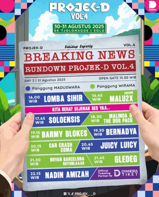 Selain suguhan dari deretan line up utama, PROJEK-D VOL.4 juga menghadirkan penampilan spesial stand-up comedy dari komunitas Standup Indo Solo melalui segmen bertajuk “Guyonlah”. Komika Anggito akan menghibur penonton pada 30 Agustus 2025 pukul 17.45 WIB, sementara Bryan Barcelona akan tampil pada 31 Agustus 2025 pukul 21.30 WIB. Kedua penampilan ini menjadi selingan segar yang menambah warna dan keseruan festival dan menghibur penonton.