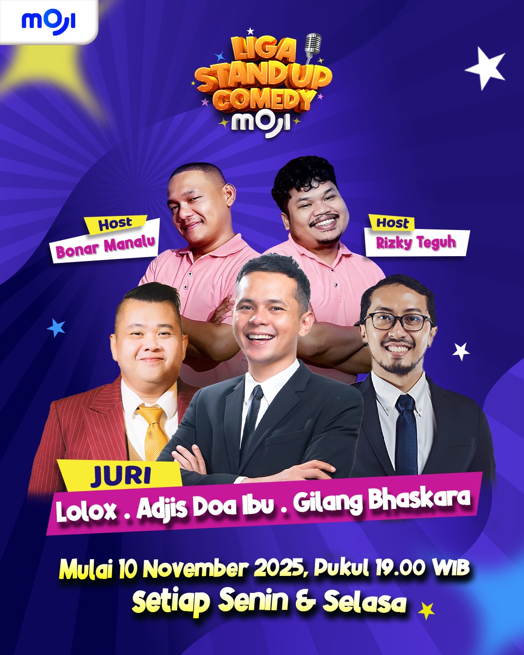 Nantikan “Liga Stand Up Comedy MOJI” setiap hari Senin dan Selasa, mulai 10 November 2025 pukul 19.00 WIB, di MOJI!