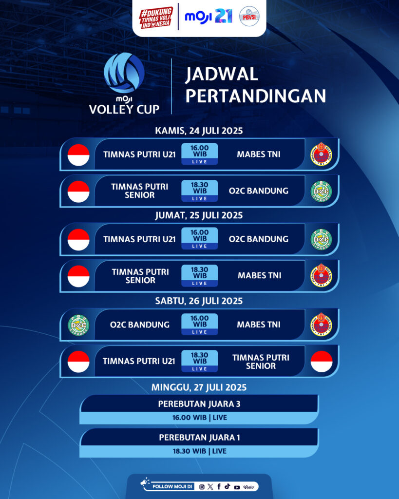 Empat tim akan berpartisipasi dalam MOJI Volley Cup 2025 ini, diantaranya Timnas Putri Senior, Timnas Putri U21, tim voli kuat dari kalangan militer Mabes TNI, serta O2C Bandung, klub yang dikenal konsisten membina atlet-atlet muda berbakat. Setiap harinya, dua pertandingan akan ditayangkan yakni pukul 16.00 WIB dan pukul 18.30 WIB. Format turnamen akan mempertemukan seluruh tim dalam sistem round-robin sebelum masuk ke babak perebutan juara tiga dan final yang berlangsung di hari Minggu, 27 Juli 2025.