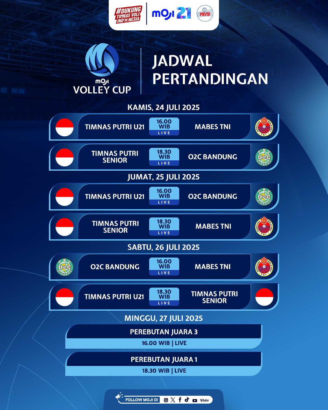 MOJI Volley Cup 2025 menjadi panggung pemanasan strategis bagi Timnas Putri Senior menjelang SEA V League 2025 yang akan digelar di Thailand dan Vietnam mulai 1 Agustus 2025 mendatang. Ajang ini juga digunakan untuk mematangkan persiapan skuad muda Timnas Putri U21 Indonesia menghadapi FIVB Women’s U21 World Championship yang akan bergulir pada 7 Agustus 2025 di Surabaya. MOJI Volley Cup 2025 diharapkan menjadi momen evaluasi teknis sekaligus adu strategi bagi dua tim nasional Indonesia dalam menghadapi lawan-lawan kelas dunia.
