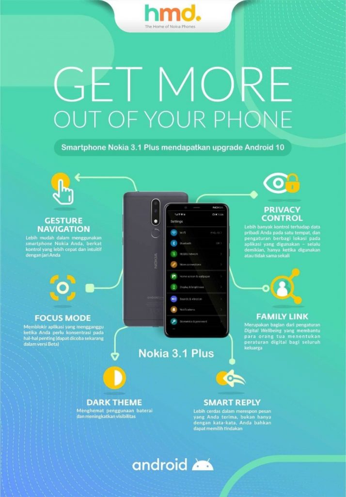 Dengan kehadiran Android 10 sebagai update OS dalam perangkat ini, HMD Global semakin mengukuhkan komitmennya menghadirkan smartphone Nokia yang terus kekinian dari waktu ke waktu dengan pembaruan OS dua tahun dan keamanan bulanan selama tiga tahun.