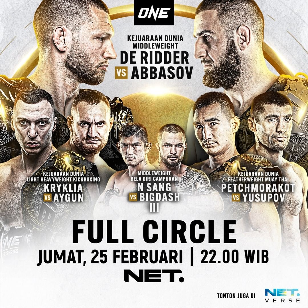 ONE Championship merupakan ajang pengembangan atlet beladiri yang didirikan sejak 14 juli 2011 dan berbasis di Singapura. Pada ONE: Full Circle, akan ditampilkan 12 laga yang mencakup MMA, Muay Thai, dan kickboxing. Di laga utama, atlet asal Belanda Reinier de Ridder dan atlet asal Kirgizstan Kiamrian Abbasov akan memperebutkan gelar juara dunia middleweight. Laga pendukung utama kejuaraan dunia light heavyweight kickboxing yang menampilkan Roman Kryklia dan Murat Aygun yang telah lama dinanti akhirnya terlaksana, setelah beberapa jadwal yang dibatalkan selama dua tahun terakhir.