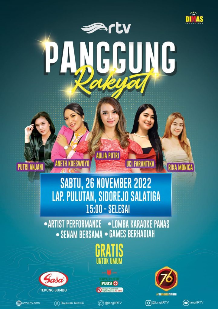 Panggung Rakyat RTV ini diyakini bakal semarak karena dimeriahkan artis lokal maupun ibukota seperti Putri Anjani, Aneth Koeswoyo, Aulia Putri, Uci Farantika, dan Rika Monica yang siap menggoyang masyarakat Salatiga dengan lagu-lagu dangdut terhits.