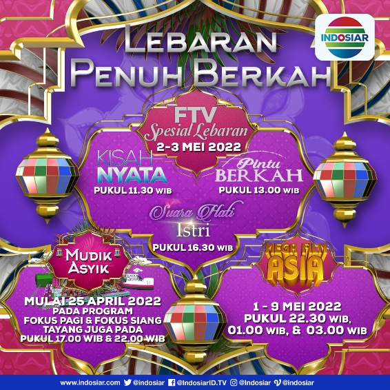 Selain menayangkan siaran langsung Sidang Isbat 1 Syawal 1443 H pada 1 Mei 2022 dan Salat Ied 1 Syawal 1443 H pada 2 Mei 2022 pukul 07.00 WIB, INDOSIAR juga akan menghadirkan sejumlah film terbaik Asia dalam Mega Film Asia dan program FTV favorit Spesial Lebaran di siang hingga sore hari selama libur lebaran, serta info arus mudik lewat Mudik Asyik, yang akan hadir mulai 25 April 2022.