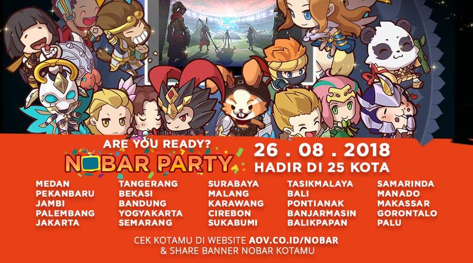 Seluruh pecinta game AOV dan Asian Games 2018 diajak untuk menyemarakkan pesta ini yang akan dilaksanakan pada tanggal 26 Agustus 2018 secara serentak di 25 kota di Indonesia.