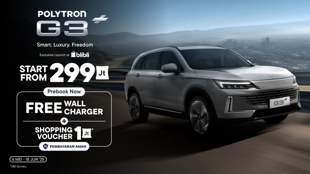 Menyambut hadirnya mobil listrik pertama dari Polytron di Blibli, Edward Kilian Suwignyo, Group Head of Emerging Category Blibli mengungkapkan antusiasmenya, “Kami bangga dipercaya sebagai mitra e-commerce eksklusif Polytron Indonesia untuk peluncuran mobil listrik pertamanya. Kami menyiapkan halaman khusus official store Polytron untuk masyarakat bisa melakukan pre-book Polytron G3 & G3+ di mana saja mereka berada, hingga 11 Juni 2025. Kami juga menghadirkan penawaran khusus yang mencakup priority delivery, free wall charger untuk 100 transaksi pertama, dan voucher belanja hingga Rp 1 juta untuk 60 pelanggan pertama.”