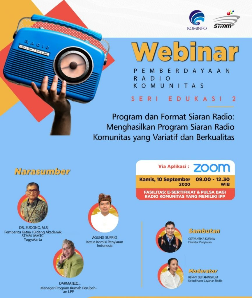Webinar ini menghadirkan Dr. Sudono, M.Si (Pembantu Ketua I Bidang Akademik STMM ‘MMTC’ Yogyakarta), Agung Suprio (Ketua Komisi Penyiaran Indonesia), Darmanto (Manager Program Rumah Perubahan LPP) sebagai narasumber yang diselenggarakan melalui Zoom, dan juga dapat melalui Youtube live streaming.