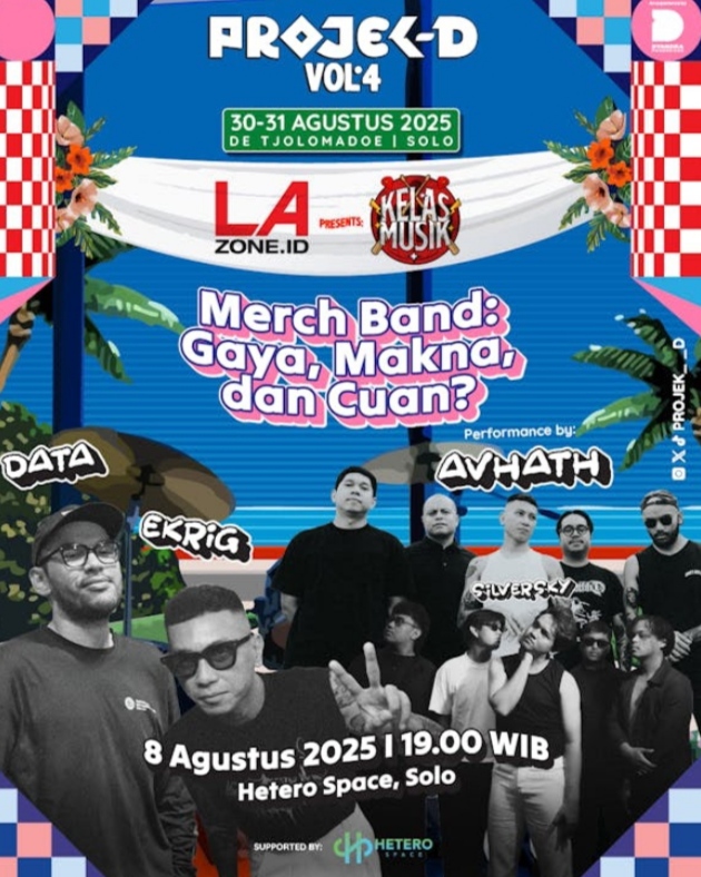 Kelas Musik PROJEK-D Vol. 4 akan diselenggarakan pada 8 Agustus 2025 pukul 19.00 WIB bertempat di Hetero Space, Solo. Pada sesi ini, akan hadir dua narasumber utama yaitu Ekrig dari Pure Evil Merch, serta Data Pratama, selaku Project Manager PROJEK-D, yang akan membagikan pengalaman, perspektif, serta materi edukatif yang relevan dengan kebutuhan musisi independen di era industri kreatif saat ini. Menambah semarak kegiatan, Kelas Musik juga akan menghadirkan penampilan spesial dari Avhath dan Silversky. Kelas Musik dibuka untuk umum, bagi pengunjung yang ingin mengikuti kegiatan ini, registrasi dapat dilakukan melalui tautan resmi https://dyandra.id/s/RegistKelasMusik.