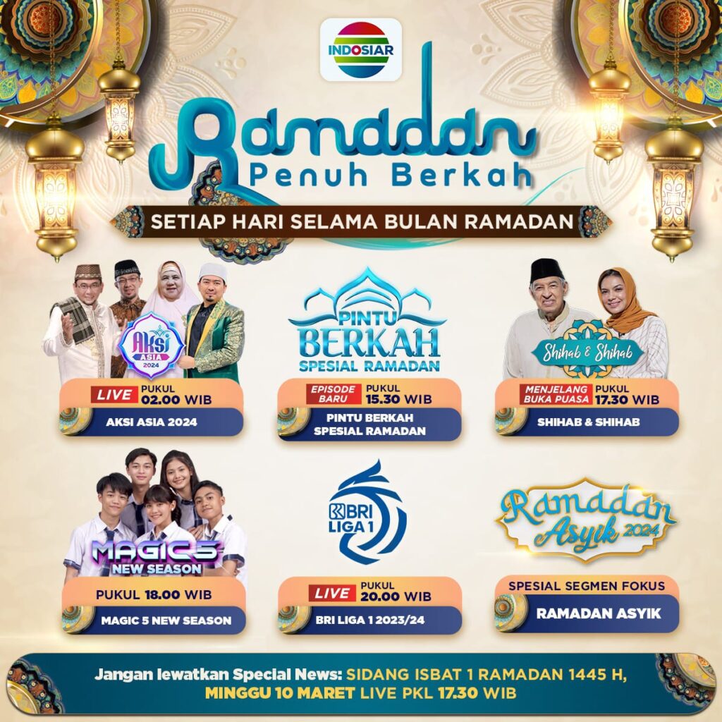 Indosiar kembali akan menghadirkan talent search yang menjadi salah satu signature program Ramadan Indosiar, yakni “AKSI Asia 2024” di waktu sahur. Sementara program “Pintu Berkah Spesial Ramadan” akan hadir di sore hari dilanjutkan program kultum “Shihab & Shihab” mendekati waktu berbuka puasa. Mega Series “Magic 5” yang sukses menyita perhatian pemirsa sejak Ramadan tahun lalu, akan tampil penuh kejutan dalam “Magic 5 New Season”. Sementara kompetisi sepak bola kasta tertinggi di Indonesia “BRI Liga 1 2023/2024” akan tetap tayang di waktu malam. Segmen “Ramadan Asyik” dalam program berita “Fokus” serta siaran langsung “Sidang Isbat 1 Ramadan 1445 H” dan “Sidang Isbat 1 Syawal 1445 H” juga akan turut mewarnai layar Indosiar.