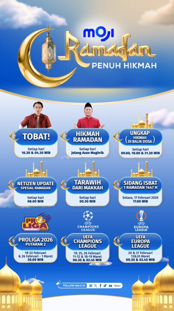 Selama Bulan Suci Ramadan, MOJI akan menayangkan suasana Tarawih langsung dari Tanah Suci melalui program “Tarawih dari Makkah” yang akan hadir setiap hari pukul 00.30 WIB. Selain itu, MOJI turut menghadirkan siaran Sidang Isbat penetapan 1 Ramadan 1447 H yang akan ditayangkan pada Selasa, 17 Februari 2026 pukul 17.00 WIB, serta Sidang Isbat penetapan 1 Syawal 1447 H pada Kamis, 19 Maret 2026.