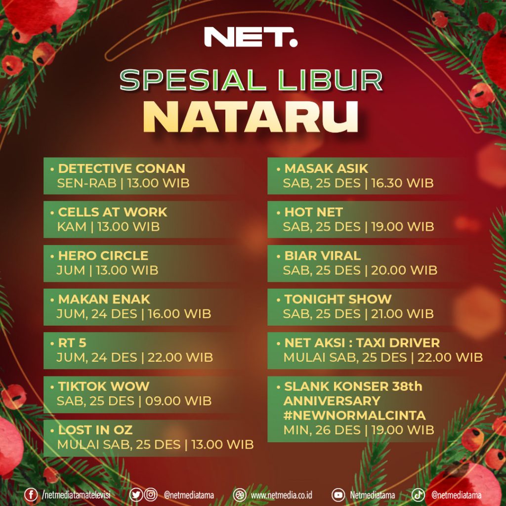 Program spesial libur Nataru garapan NET hadir mulai 24 Desember 2021 lewat keseruan “RT5 Spesial Natal” pukul 22.00 WIB dan “Tonight Show Spesial Natal” yang menghadirkan penyanyi asal Wales Jamie Miller pada tanggal 25 Desember 2021 pukul 21.00 WIB. Selain itu NET juga siap menyajikan program musik spesial Slank Konser 38th Anniversary #NewNormalCinta yang akan tayang di NET pada tanggal 26 Desember 2021 pukul 19.00 WIB.