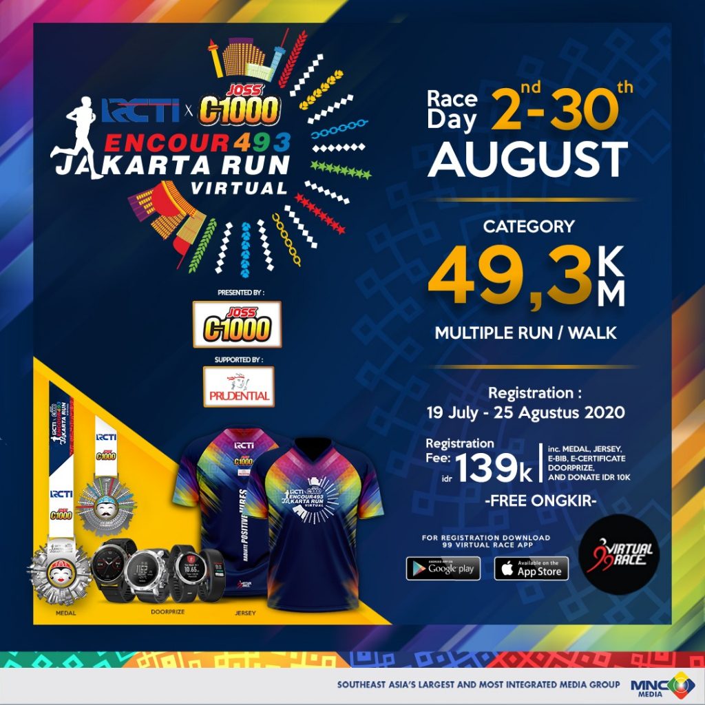 Pendaftaran runner RCTI ENCOUR493 Jakarta Run dimulai dari 19 Juli hingga 25 Agustus 2020 dengan biaya pendaftaran sebesar Rp 139.000,-.