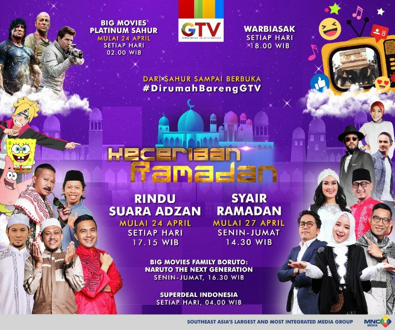Saksikan rangkaian program Keceriaan Ramadan dan program unggulan lainnya seperti : Spongebob Squarepants, Avatar The Legend Of Aang, Boruto : Naruto The Next Generation, Uang Kaget dan Bedah Rumah setiap hari hanya di GTV yang akan tayang mulai Jumat 24 April 2020 hanya di GTV.