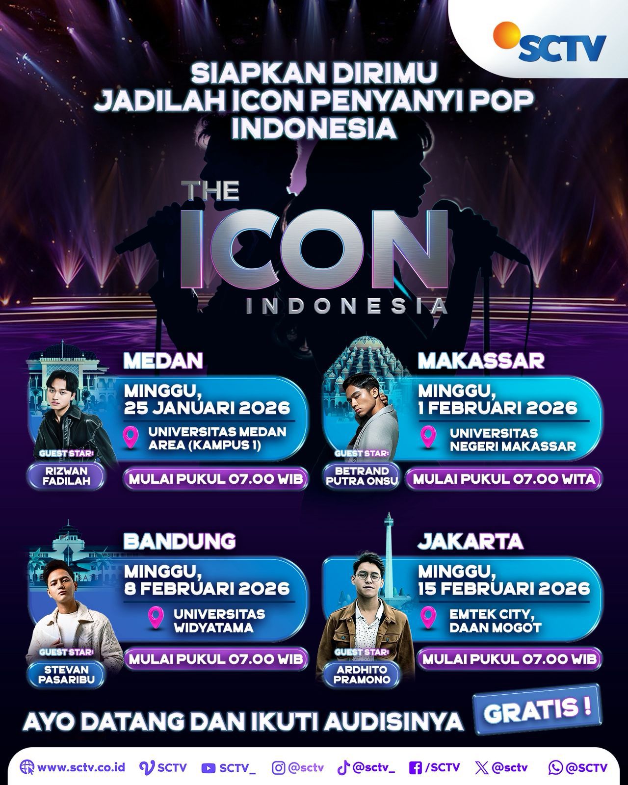 SCTV sudah memulai audisi online “The Icon Indonesia” sejak pertengahan Januari 2026, menjaring talenta dari kota-kota yang terkendala jarak untuk hadir langsung ke audisi offline terbuka di Medan, Makassar, Bandung dan Jakarta. Namun audisi offline terbuka akan menjadi pengalaman berharga yang berbeda, karena para peserta terpilih akan bertatap muka langsung dengan para juri professional mendapatkan motivasi khusus dari penyanyi dan musisi profesional yang hadir di tiap kotanya. “SCTV siap membersamai para talenta penyanyi pop Indonesia untuk tumbuh dan makin matang sehingga pantas menjadi ikon baru musik pop tanah air melalui ‘The Icon Indonesia’,” tutup Banardi Rachmad, Deputy Director Programming SCTV.