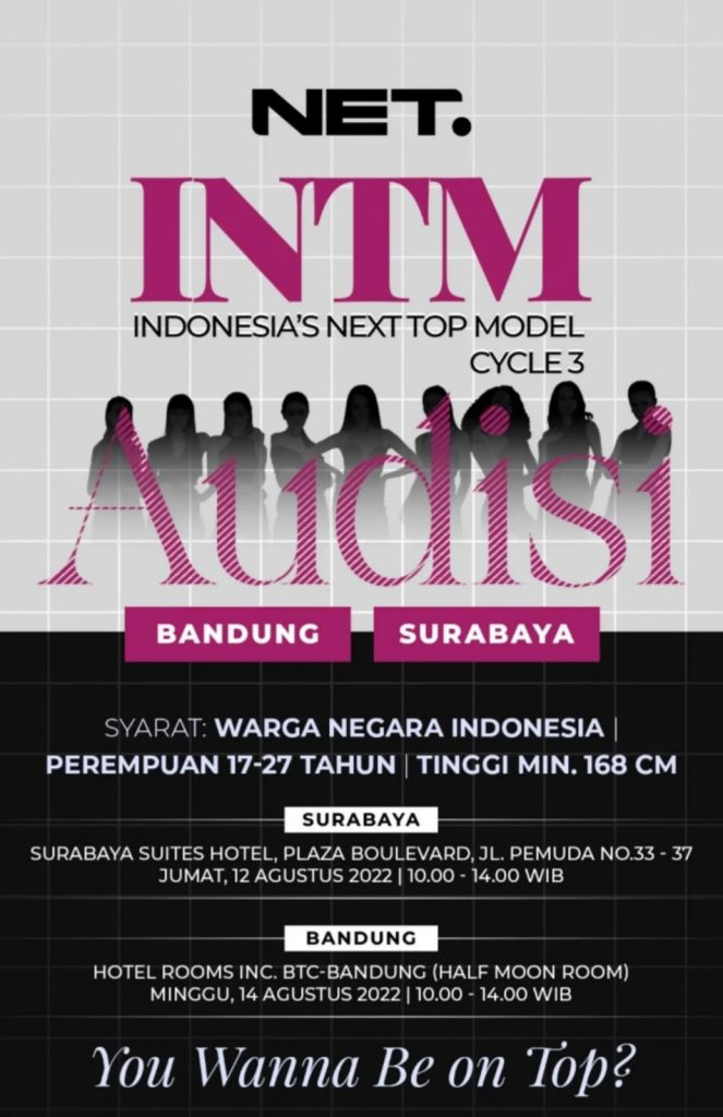 Pendaftaran INTM Cycle 3 sebenarnya telah dibuka secara online mulai 1 sampai 15 Agustus 2022 melalui website http://intm.netmedia.co.id. Audisi di Surabaya dan Bandung dibuka untuk mengantisipasi antusiasme calon peserta INTM Cycle 3 yang kesulitan mendaftarkan secara online. Syarat mengikuti Indonesia’s Next Top Model Cycle 3, antara lain: perempuan berkewarganegaraan Indonesia, usia 17 sampai 27 tahun, dan memiliki tinggi minimal 168 cm. Audisi peserta ajang INTM Cycle 3 nantinya akan menjalani rangkaian aktivitas seleksi, mulai dari wawancara, psikotes, tes kesehatan, tes foto, hingga catwalk.