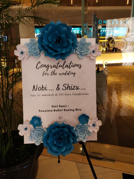 Tak heran bila ada papan booth bertuliskan nama mempelai pria dan wanita di lobi bioskop, membuat suasana bioskop seperti menghadirkan pernikahan sungguhan.