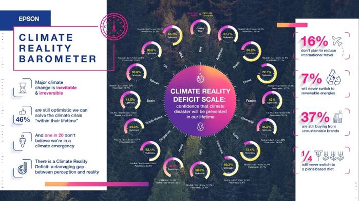 Seperti yang dilaporkan oleh Intergovernmental Panel on Climate Change (IPCC) bahwa beberapa perubahan iklim yang disebabkan oleh manusia akan membutuhkan waktu ribuan tahun untuk kembali, dan mengingat serangkaian peristiwa global — termasuk suhu terpanas di bulan juli yang pernah tercatat, kebakaran hutan di Eropa, Amerika Utara dan Asia, dan banjir di Cina, Kolombia, dan Jerman — Barometer Realitas Iklim Epson menemukan peningkatan optimisme atas bukti-bukti tersebut dan pengurangan kerusakan iklim yang nyata.