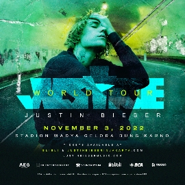 Justin Bieber telah resmi mengumumkan jadwal tur dunia terbarunya yang bertajuk “Justice World Tour” dan akan singgah ke Jakarta, Indonesia pada tanggal 3 November 2022 di Stadion Madya, Gelora Bung Karno.