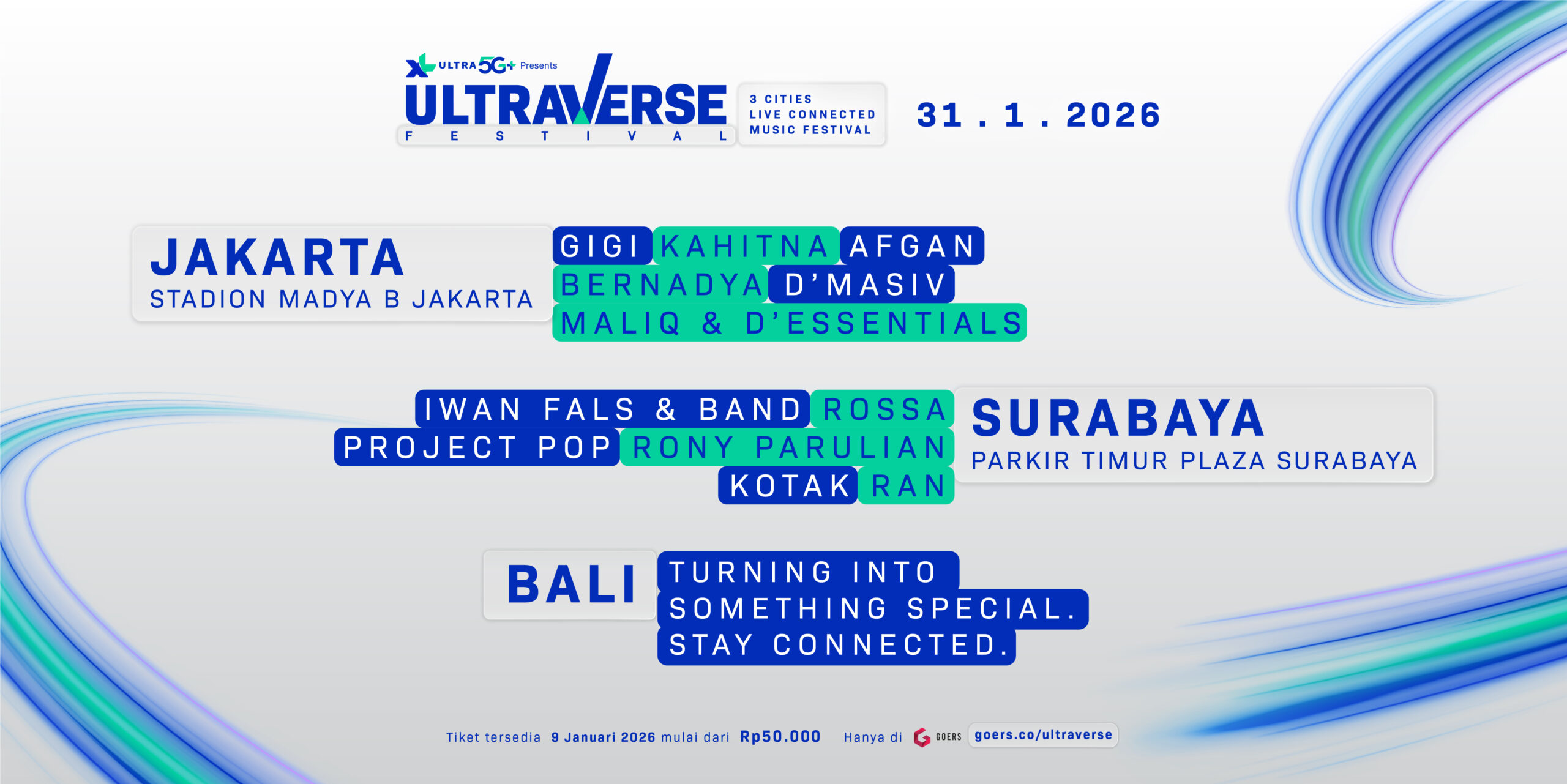 “Untuk sebuah festival musik, penyelenggaraan ini menjadi sebuah terobosan karena memungkinkan pertunjukan berlangsung serentak tanpa jeda di 3 kota, dengan konsep kolaborasi real-time. Dengan dukungan layanan XL Ultra 5G+, Ultraverse Festival menghadirkan pengalaman menonton yang terasa utuh, presisi, dan saling terhubung.”