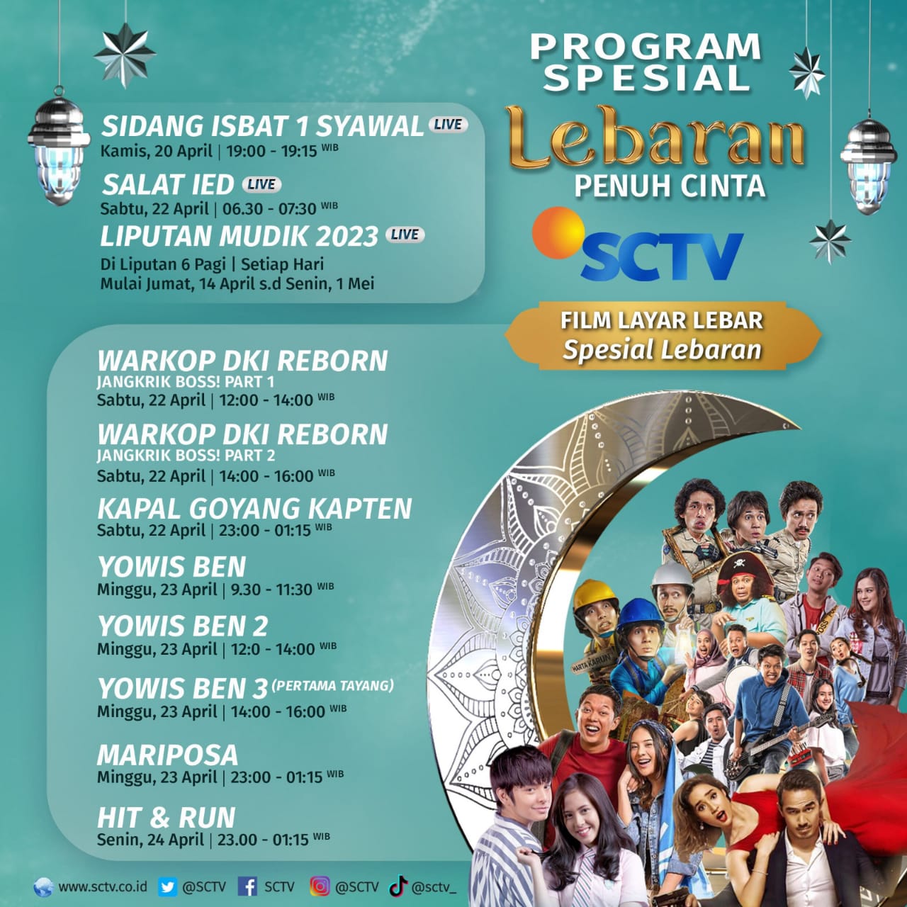 Sebelumnya, SCTV juga akan menayangkan siaran langsung Salat Ied pada 1 Syawal 1444 H. Sementara aksi komedi dari Dono, Kasino, Indro yang diperankan Abimana Aryasatya, Vino G Bastian dan Tora Sudiro akan hadir dalam “Warkop DKI Reborn: Jangkrik Boss! Part 1” pada hari Sabtu, 22 April 2023 pukul 12.00 WIB. Ketiganya terpaksa harus membayar ganti rugi karena telah merusak sebuah lukisan seharga 8 Miliar rupiah. Kelanjutan kisah mereka akan kembali dihadirkan dalam “Warkop DKI Reborn: Jangkrik Boss! Part 2” di hari yang sama pada pukul 14.00 WIB.
